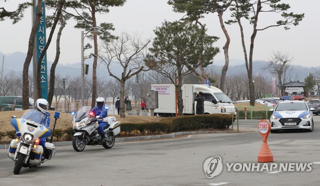 | ▲ A truck carrying AstraZeneca's COVID-19 vaccine arrives at a public health center in Cheongju, about 130 kilometers south of Seoul, under the escort of the military and police on Feb. 25, 2021. (Yonhap) |