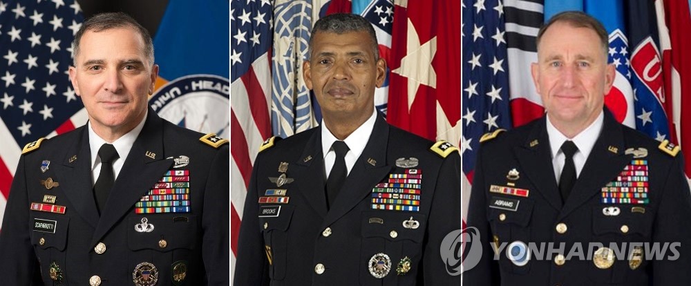 | ▲ These undated file photos, provided by the Ministry of Patriots and Veterans Affairs, show former U.S. Forces Korea (USFK) commanders -- Gen. Curtis Scaparrotti (L), Gen. Vincent Brooks (C) and Gen. Robert Abrams. (PHOTO NOT FOR SALE) (Yonhap) |