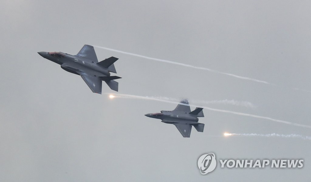▲ F-35A fighter jets drop flares during the South Korea-U.S. Combined Joint Live-Fire Exercise at the Seungjin Fire Training Field in Pocheon, 52 kilometers northeast of Seoul, on May 25, 2023, in this photo released by Korea Defense Daily. (PHOTO NOT FOR SALE) (Yonhap)