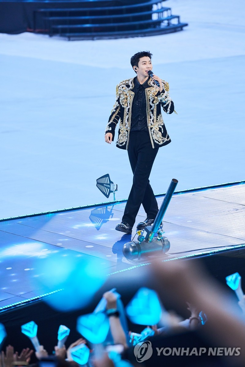 임영웅은 이날 반짝이 장식이 덮인 검은 정장 차림으로 리프트를 타고 공중에서 내려왔다. 그는 자신을 상징하는 하늘색 물결이 일렁이는 광경에 뿌듯한 미소를 지어 보였다.