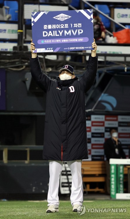 | ▲ Chris Flexen of the Doosan Bears hoists the sign showing him as the Player of the Game for Game 1 of the Korea Baseball Organization first-round playoff series against the LG Twins at Jamsil Baseball Stadium in Seoul on Nov. 4, 2020. (Yonhap) |