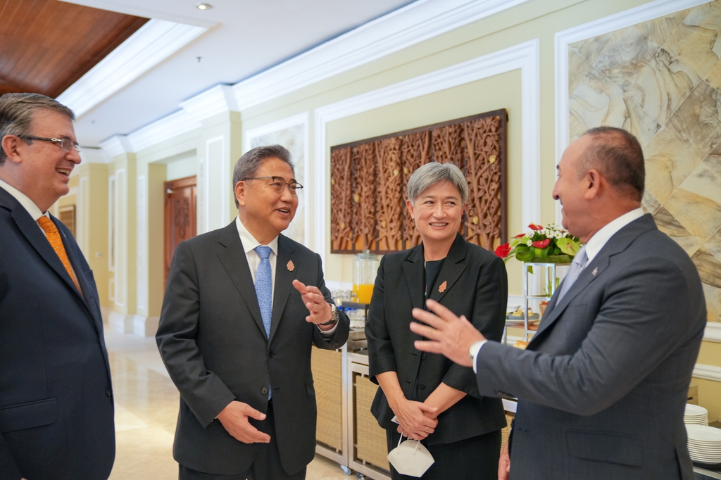 | ▲ South Korean Foreign Minister Park Jin (2nd from L) speaks with the foreign ministers from four other MIKTA members -- Mexico, Indonesia, Turkey and Australia -- in Bali on July 7, 2022, on the sidelines of the G-20 foreign ministerial meeting, in this photo provided by Park's office. (PHOTO NOT FOR SALE) (Yonhap) |