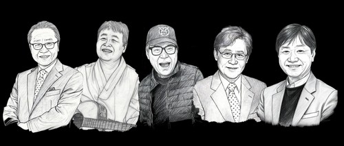 ▲ '쎄시봉, 더 라스트 콘서트' 출연진 왼쪽부터 방송인 이상벽, 가수 송창식, 조영남, 윤형주, 김세환 [쇼플러스 제공. 재판매 및 DB 금지]