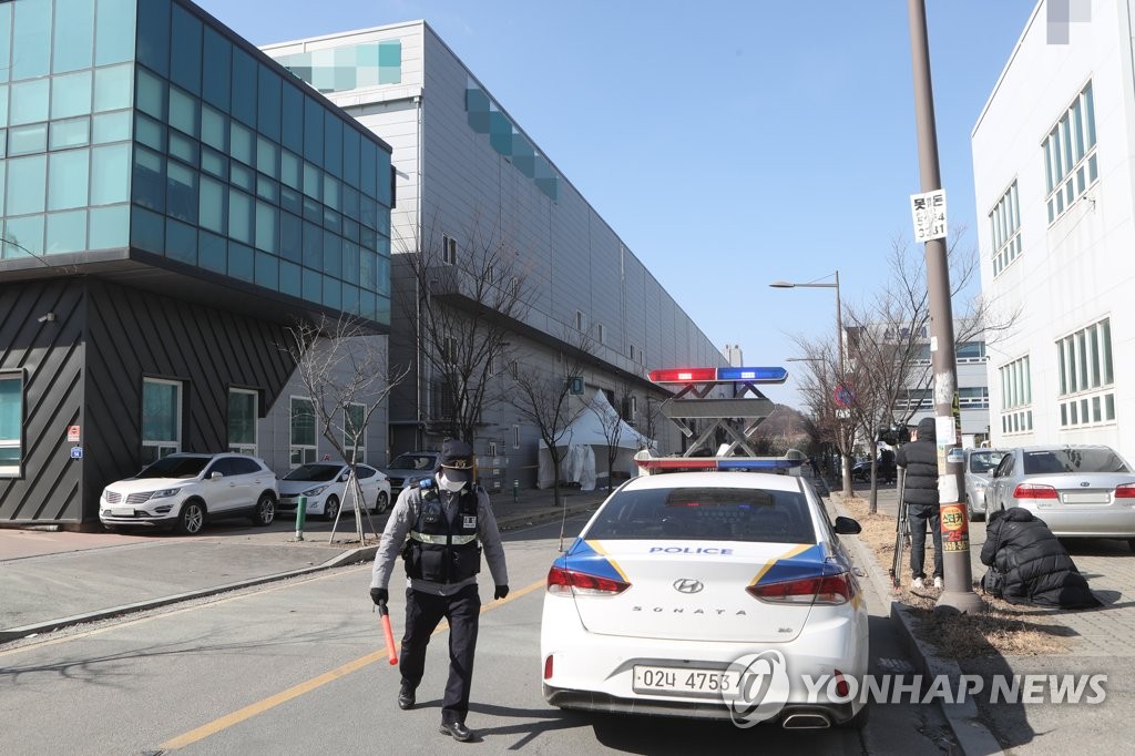 | ▲ A police officer controls road traffic at an industrial complex in Namyangju, southeast of Seoul, on Feb. 17, 2021, after 114 employees at a factory tested positive for COVID-19. (Yonhap) |