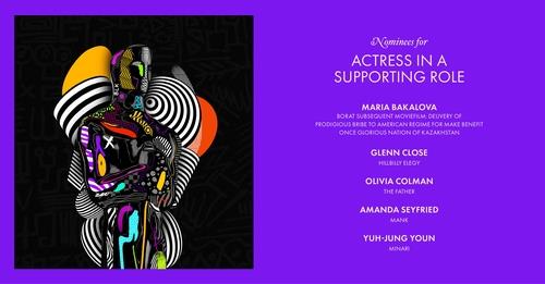 At the same time, Youn, who played an eccentric grandmother in "Minari," was among the five candidates for best actress in a supporting role with Maria Bakalova for "Borat Subsequent Moviefilm," Glenn Close for "Hillbilly Elegy," Olivia Colman for "The Father" and Amanda Seyfried for "Mank."