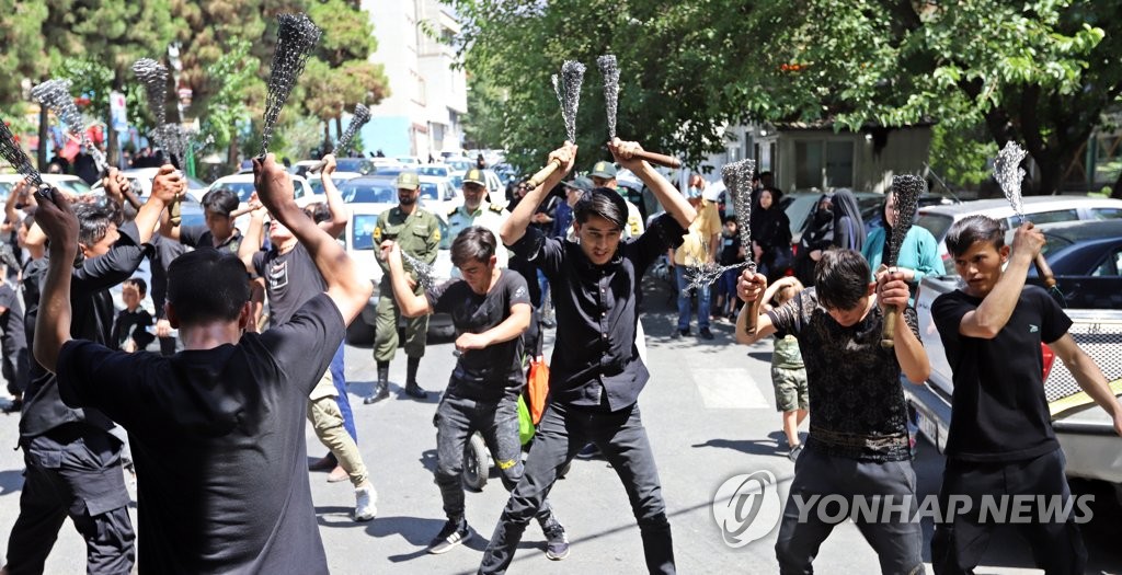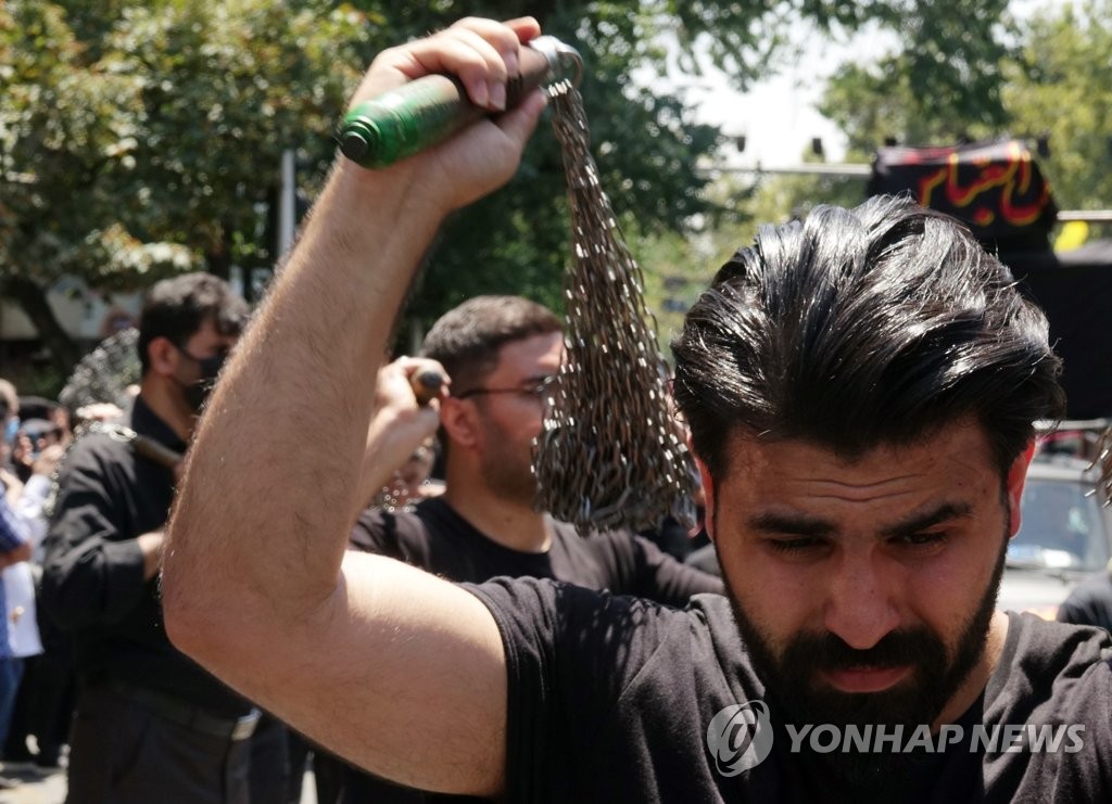 | ▲ 이란 테헤란 '아슈라' 추모 행진 (테헤란=연합뉴스) 이승민 특파원 = 8일(현지시간) 이란 테헤란 샤리아티 거리에서 열린 '아슈라' 기념행사에 참석한 시민이 쇠사슬 채찍으로 자신의 어깨를 때리고 있다. 아슈라는 이슬람 시아파 최대 행사로 이맘 후세인의 비극적인 죽음을 추모하는 날이다. 2022.8.8 logos@yna.co.kr |