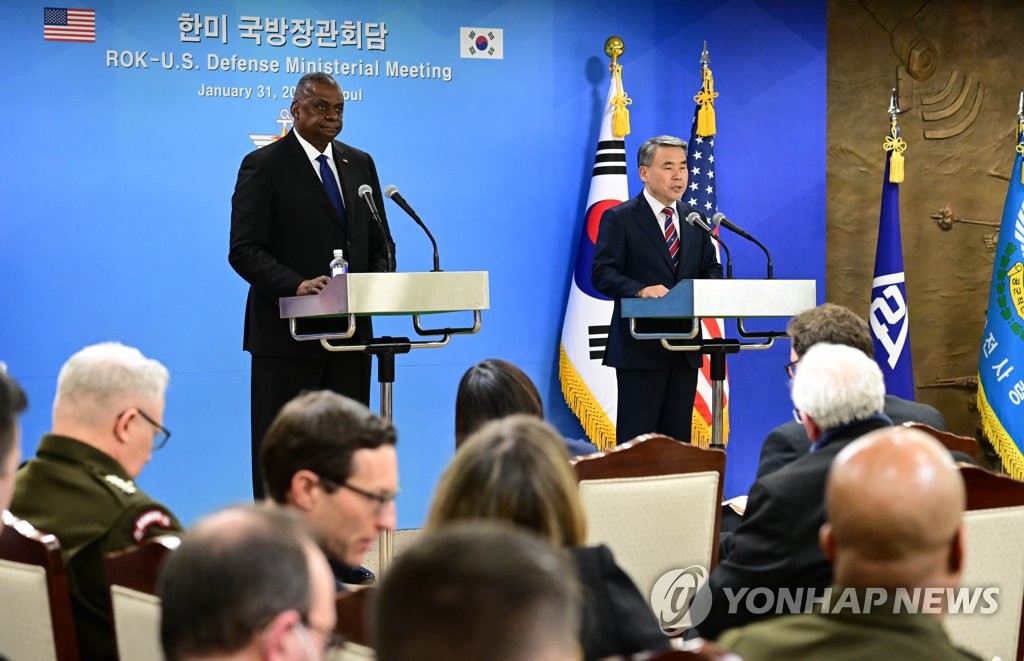 | ▲ South Korean Defense Minister Lee Jong-sup (R) and his U.S. counterpart, Lloyd Austin, hold a joint press conference after their talks at the defense ministry in Seoul on Jan. 31, 2023. (Pool photo) (Yonhap) |