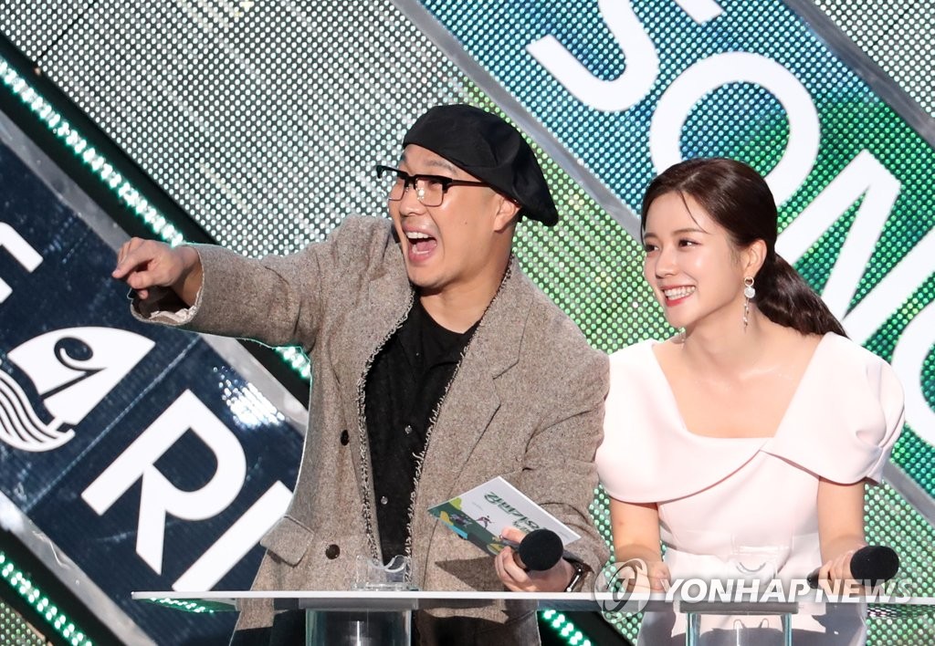 | ▲ 강변가요제 진행 맡은 하하-정다희 (원주=연합뉴스) 양지웅 기자 = 3일 오후 강원 원주시 간현관광지 특설무대에서 열린 'MBC 강변가요제 뉴챌린지' 본선 무대에서 진행을 맡은 방송인 하하(왼쪽)와 정다희 아나운서가 밝게 웃고 있다. 2022.9.3 yangdoo@yna.co.kr |