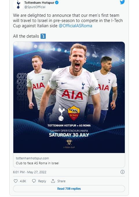 토트넘은 27일 구단 홈페이지에 "우리 1군 팀이 2022-2023시즌을 앞두고 이스라엘로 가서 AS로마와 아이-테크컵(I-Tech Cup)을 치른다"고 밝혔다.