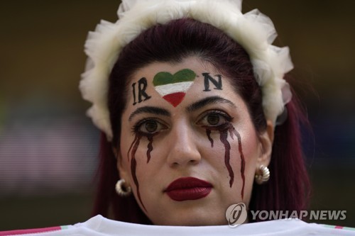 | ▲ 마흐사 아미니 추모하는 이란 축구 팬 (도하 AFP=연합뉴스) 2022 국제축구연맹(FIFA) 카타르 월드컵 조별리그 B조 웨일스 대 이란 경기가 열리는 25일(현지시간) 카타르 도하에서 피눈물이 흐르는 분장을 한 어느 이란 축구 팬이 지난 9월 숨진 마흐사 아미니의 이름과 나이(22)가 적힌 셔츠를 들고 있다. 이란에서는 지난 9월 히잡을 적법하지 않게 착용했다는 이유로 경찰에 연행된 쿠르드인 여성 아미니가 숨지자 전국적으로 반정부 시위가 수개월째 일어나고 있다. 2022.11.25 alo95@yna.co.kr |