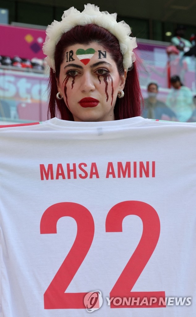 한 이란 여성은 검은 눈물을 흘리는 듯한 분장과 함께 '마흐사 아미니'라는 이름과 등번호 22가 적힌 이란 유니폼을 들었다.