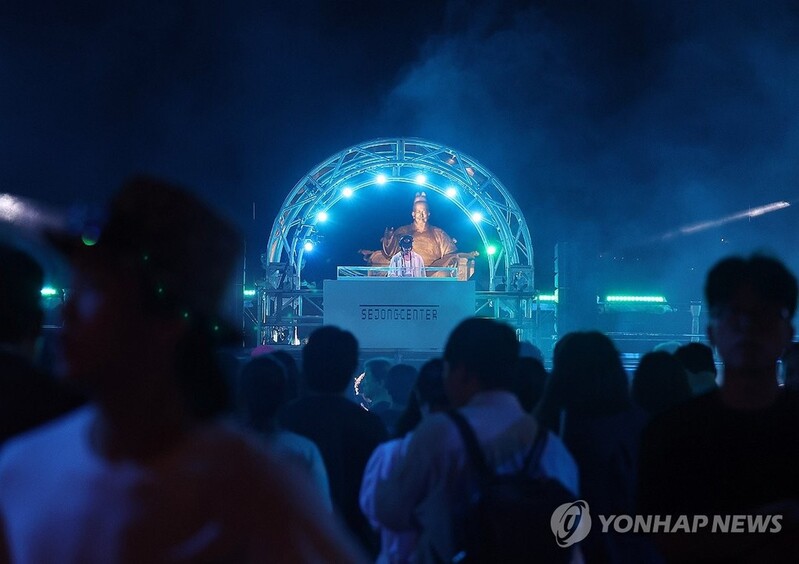| ▲ '대왕님도 즐기시고 있나요?' (서울=연합뉴스) 이지은 기자 = 25일 오후 서울 광화문광장에서 앰비규어스댄스컴퍼니의 DJ 파티가 열리고 있다. 이날 파티의 드레스코드는 패딩으로 더위를 '이열치열' 정신으로 즐겼다. 2023.8.25 jieunlee@yna.co.kr |