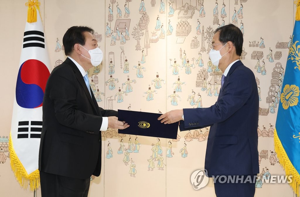 | ▲ In this file photo, President Yoon Suk-yeol (L) confers a certificate of appointment to Prime Minister Han Duck-soo at the presidential office in Seoul on May 21, 2022. (Yonhap) |