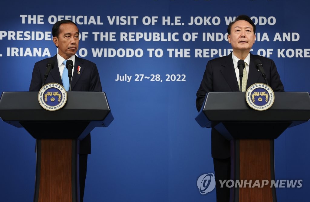 SEOUL, July 28 (Yonhap) -- President Yoon Suk-yeol and Indonesian President Joko Widodo held a summit in Seoul on Thursday and agreed to work together to stabilize supply chains of key minerals and strengthen cooperation on economic security issues.