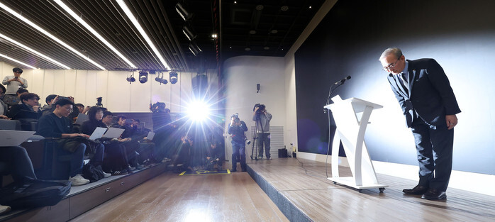 KT CEO Kim Young-shub (R) bows his head in apology over a major data breach reported in September to the public during a press briefing held in Seoul on Dec. 30, 2025. (Yonhap)