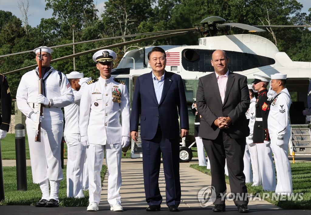 | ▲ South Korean President Yoon Suk Yeol (C, front) arrives at the Camp David presidential retreat in Maryland on Aug. 18, 2023, to attend his trilateral summit meeting with U.S. President Joe Biden and Japanese Prime Minister Fumio Kishida. (Yonhap) |