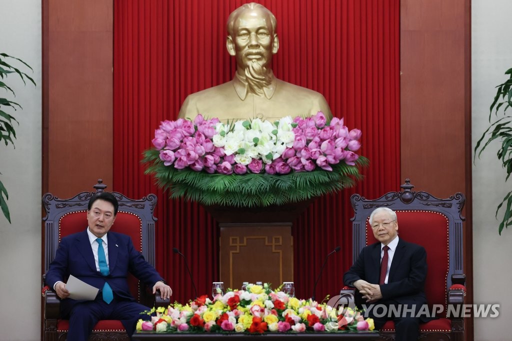 HANOI, June 23 (Yonhap) -- South Korean President Yoon Suk Yeol met Friday with the general secretary of the Communist Party of Vietnam, the most powerful position in the country, and discussed ways to develop bilateral ties, the presidential office said.