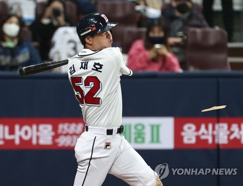 SEOUL, Nov. 20 (Yonhap) -- Kim Jae-ho drove in three runs and broke a tie with a single in the seventh, helping the Doosan Bears past the NC Dinos 7-6 on Friday and putting his team ahead in the South Korean baseball championship round.