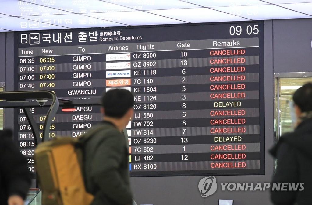 Incheon International Airport, South Korea's main gateway located west of Seoul, reported no weather-delayed cancellations as of Sunday morning.