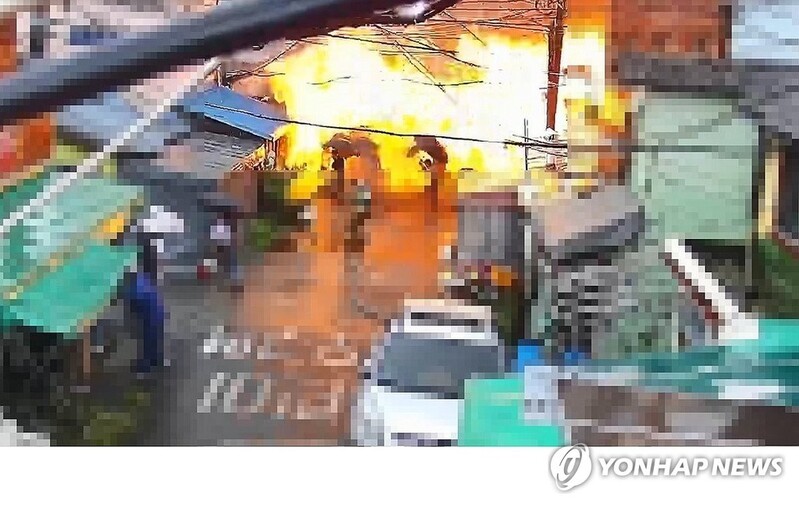 | ▲ Flames rise during a fire at a public bathhouse in the southern port city of Busan on Sept. 1, 2023, in this security camera footage by the city's Dong-gu office. (PHOTO NOT FOR SALE) (Yonhap) |