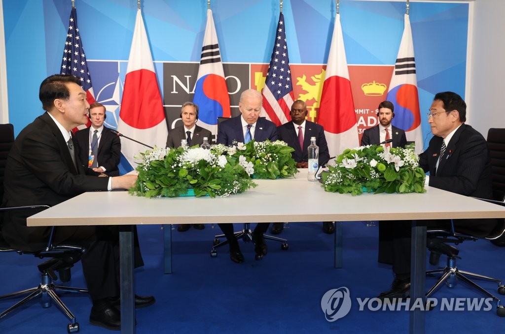 Yoon made the remark at the start of a trilateral meeting with U.S. President Joe Biden and Japanese Prime Minister Fumio Kishida on the sidelines of the North Atlantic Treaty Organization (NATO) summit in Madrid.