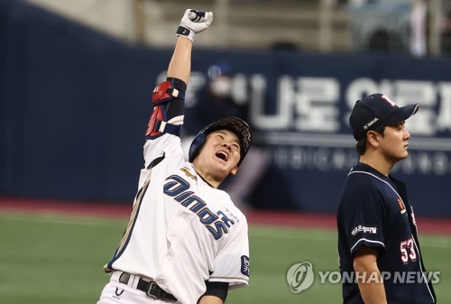 | ▲ Park Min-woo of the NC Dinos celebrates his two-run single against the Doosan Bears in the bottom of the sixth inning of Game 6 of the Korean Series at Gocheok Sky Dome in Seoul on Nov. 24, 2020. (Yonhap) |
