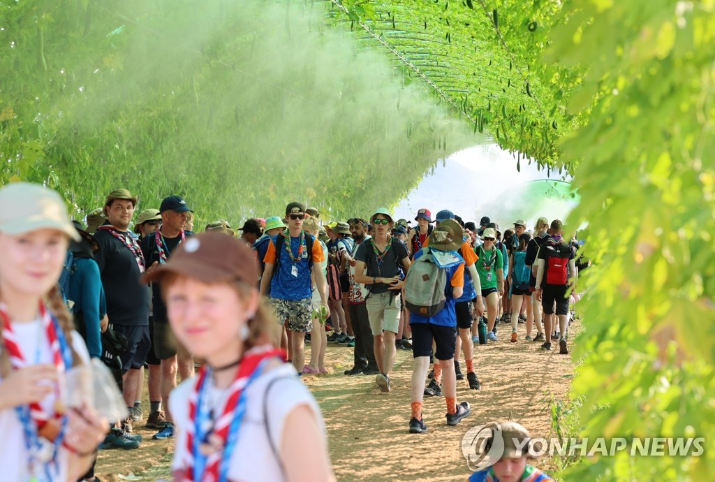 | ▲ 더위 식히는 잼버리 참가 대원들 (부안=연합뉴스) 김주형 기자 = 4일 전북 부안군에서 열리고 있는 2023 새만금 세계스카우트잼버리 대회장을 방문한 참가 대원들이 덩굴 쿨링 터널에서 더위를 식히고 있다. 2023.8.4 kjhpress@yna.co.kr |