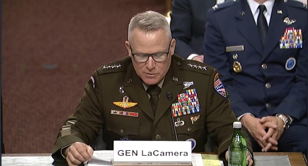 ▲ Gen. Paul LaCamera, commander of U.S. Forces Korea, is seen delivering opening remarks in a Senate armed services committee hearing in Washington, D.C., on April 20, 2023, in this captured image. (Yonhap)
