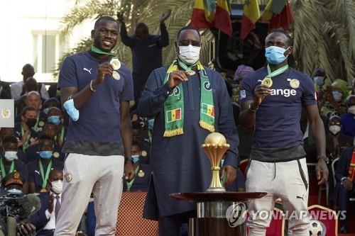 | ▲ 세네갈, 네이션스컵 우승 축구대표팀에 두둑한 포상 (다카르 AP=연합뉴스) 8일(현지시각) 세네갈 수도 다카르의 대통령궁에서 마키 살(가운데) 대통령이 국가대표팀 선수 사디오 마네(우) 등과 아프리카 네이션스컵 우승 트로피를 앞에 놓은 채 환영식을 하고 있다. 2022.2.9 photo@yna.co.kr |