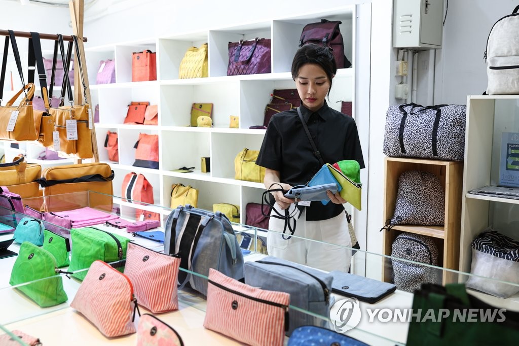 | ▲ First lady Kim Keon-hee looks at bags made by upcycling firm Smateria during a visit to the company's office in Phnom Penh on Nov. 12, 2022, in this photo provided by the presidential office. (PHOTO NOT FOR SALE) (Yonhap) |