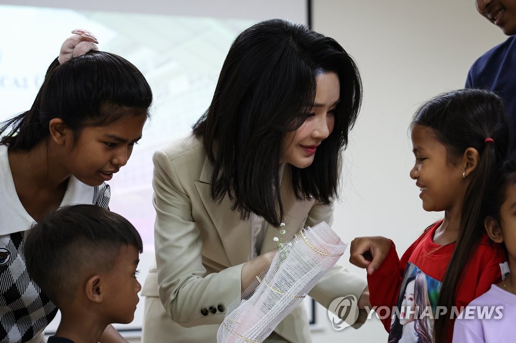 PHNOM PENH, Nov. 12 (Yonhap) -- First lady Kim Keon-hee visited the home of a Cambodian child with a heart disease Saturday and comforted the family, urging them not to give up under any circumstances, the presidential office said.