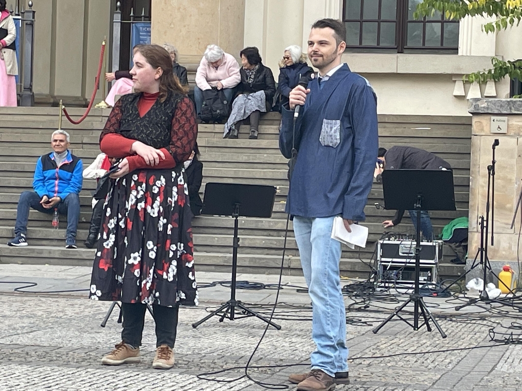 | ▲ 개회사하는 베를린자유대 한국학과 학생회 다리우스와 베티나 (베를린=연합뉴스) 이율 특파원 = 8일(현지시간) 독일의 수도 베를린의 가장 아름다운 광장인 젠다르멘마르크트에서 열린 한글날 기념행사에서 베를린자유대 한국학과 학생회 다리우스와 베티나가 개회사를 하고 있다. 2022.10.9 |