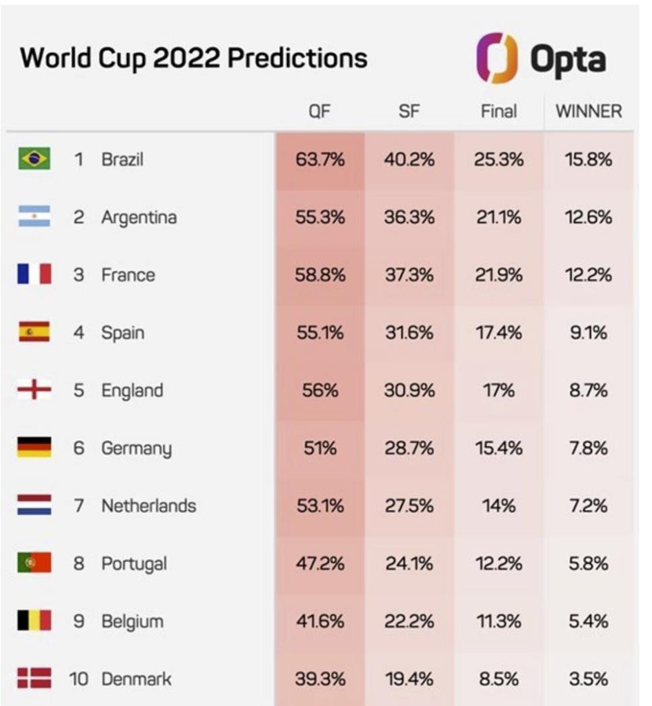 | ▲ 옵타의 카타르 월드컵 개막 전 우승 예상 순위 [옵타 트위터 계정 캡처. 재판매 및 DB 금지] |