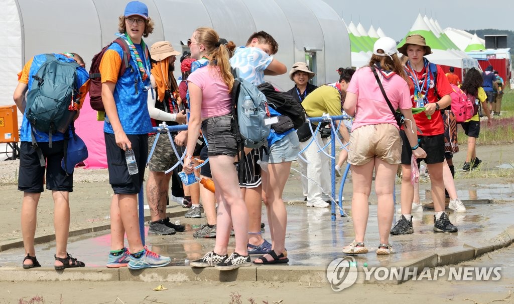 | ▲ Participants of the World Scout Jamboree gather at tap water facilities at a campsite at Saemangeum, a reclaimed land area on the southwestern coast, on Aug. 4, 2023. (Yonhap) |