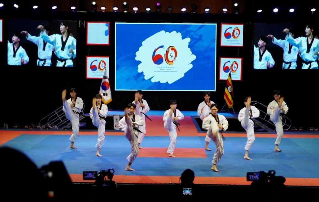 | ▲ 한-우간다 수교 60주년 한국 문화행사 (요하네스버그=연합뉴스) 지난 30일(현지시간) 아프리카 우간다 수도 캄팔라 세레나호텔에서 열린 한-우간다 수교 60주년 기념 행사에서 국기원 태권도 시범단이 공연을 하고 있다. 2023.5.31 [주우간다 한국대사관 제공] photo@yna.co.kr (끝) |