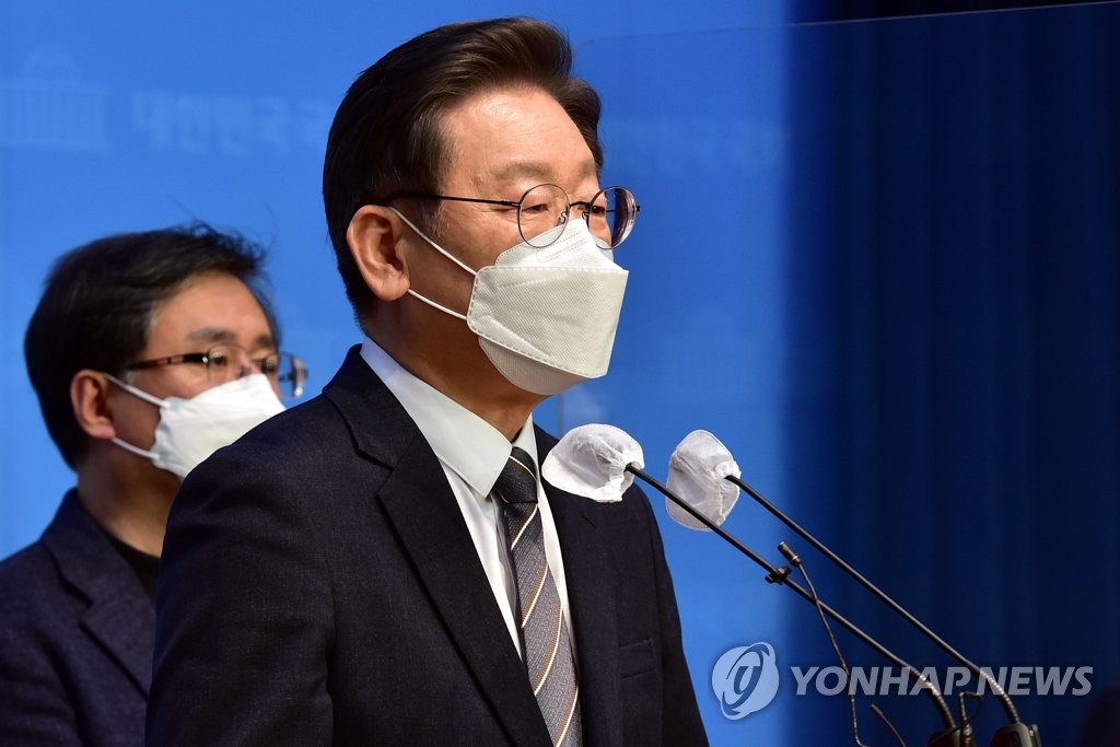 Lee spoke after presiding over a COVID-19 response meeting held by his party and noted that the government could only draw up a plan for 14 trillion won despite the DP's request for 30 trillion won because of opposition concerns about the national debt and accusations of vote-buying ahead of the March 9 presidential election.