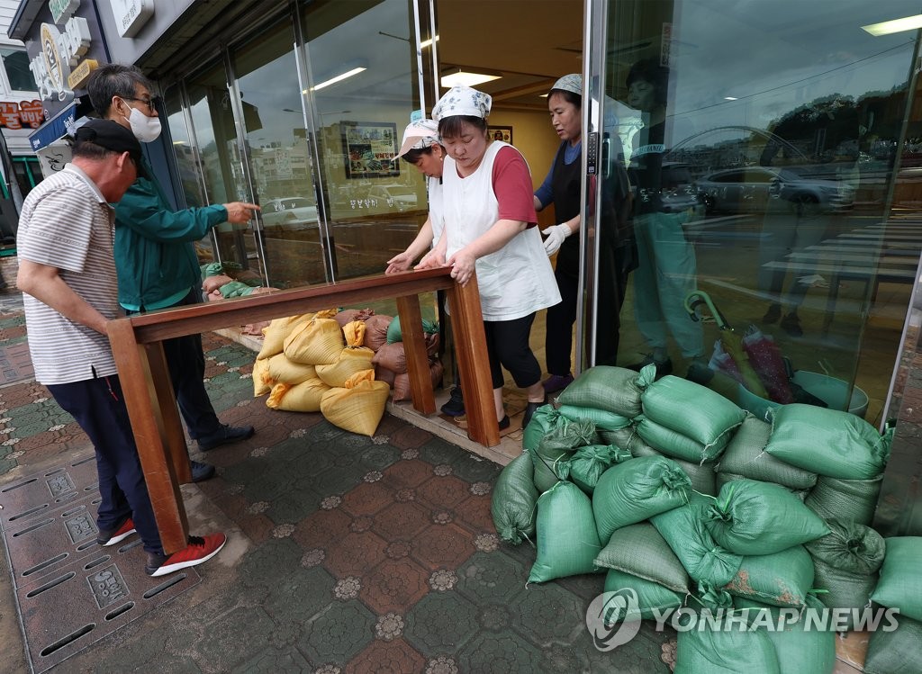 | ▲ Super Typhoon Hinnamnor approaches Windows are taped and sand bags are stacked at a restaurant in Ulsan in preparation for the approach of the super strong Typhoon Hinnamnor. (Yonhap) |