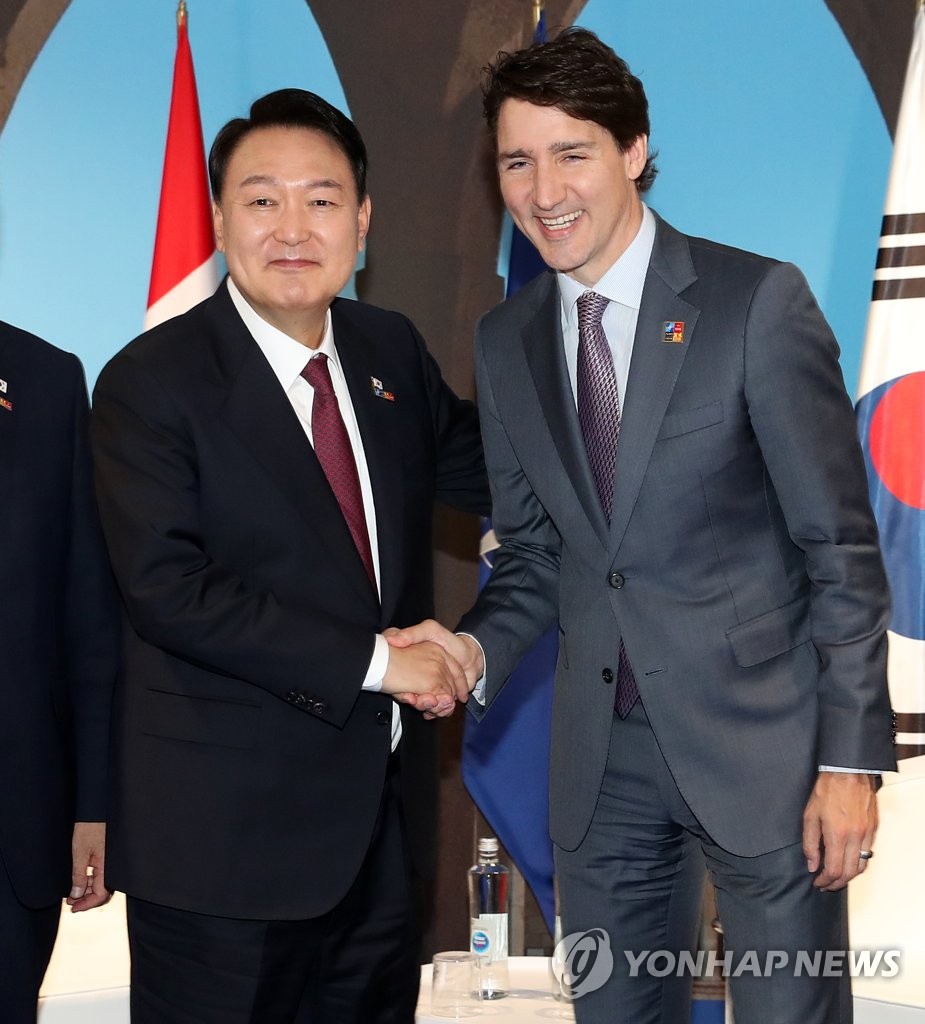▲ South Korean President Yoon Suk-yeol (L) shakes hands with Canadian Prime Minister Justin Trudeau prior to their talks at the IFEMA Convention Center in Madrid on June 30, 2022, on the sidelines of a summit of the North Atlantic Treaty Organization. (Yonhap)