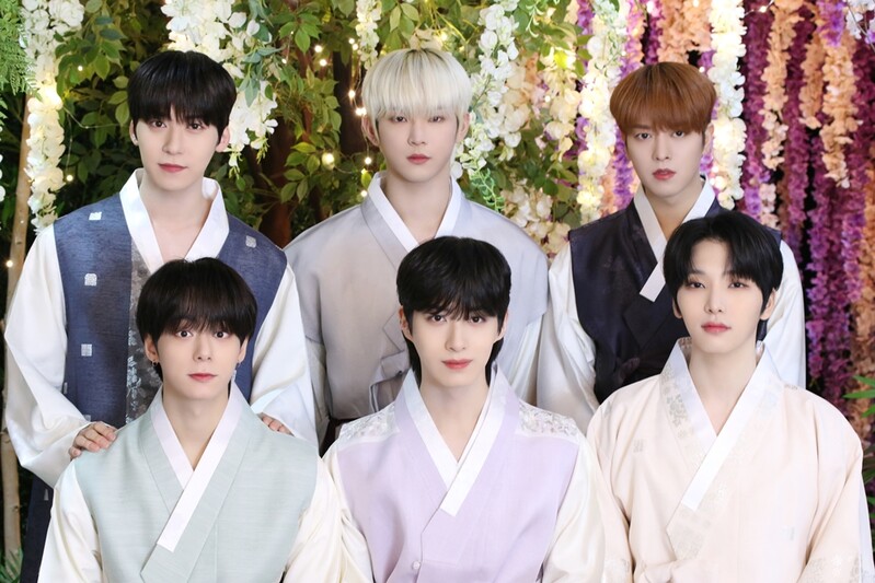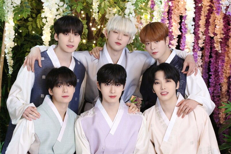 These photos, provided by RBW, show ONEUS members who are giving 2022 Lunar New Year greetings in Hanbok, the traditional Korean attire. February 1st is Lunar New Year's day.