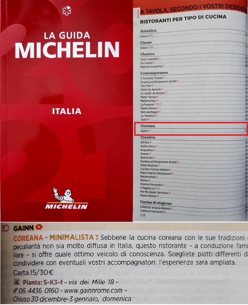 (로마=연합뉴스) 전성훈 특파원 = 이탈리아 현지 한식당이 세계 맛집 지침서인 '기드 미슐랭'(한국명 미쉐린 가이드)에 등재돼 눈길을 끈다.