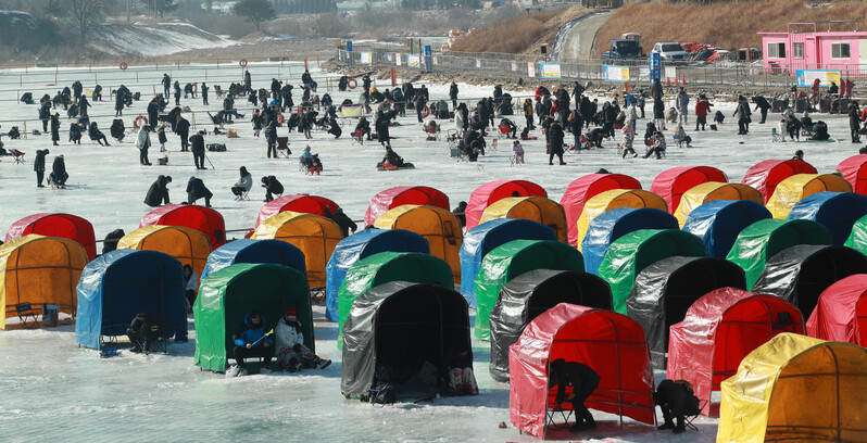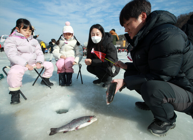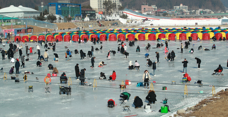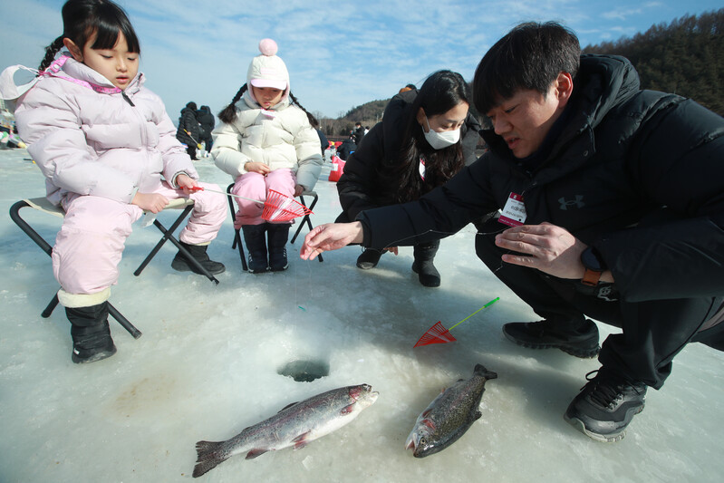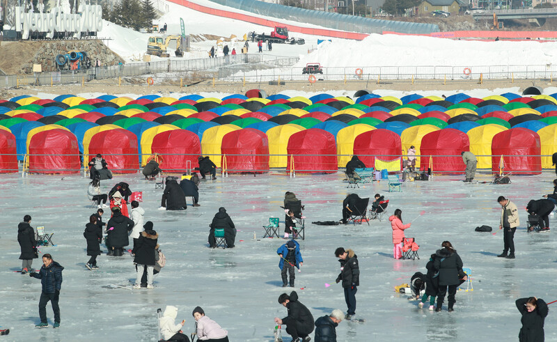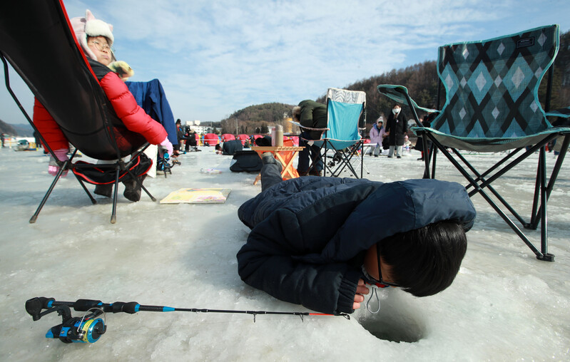Visitors enjoy ice fishing on a river at the Pyeongchang Trout Festival in Pyeongchang, about 180 kilometers east of Seoul, on Jan. 6, 2023. (Yonhap)