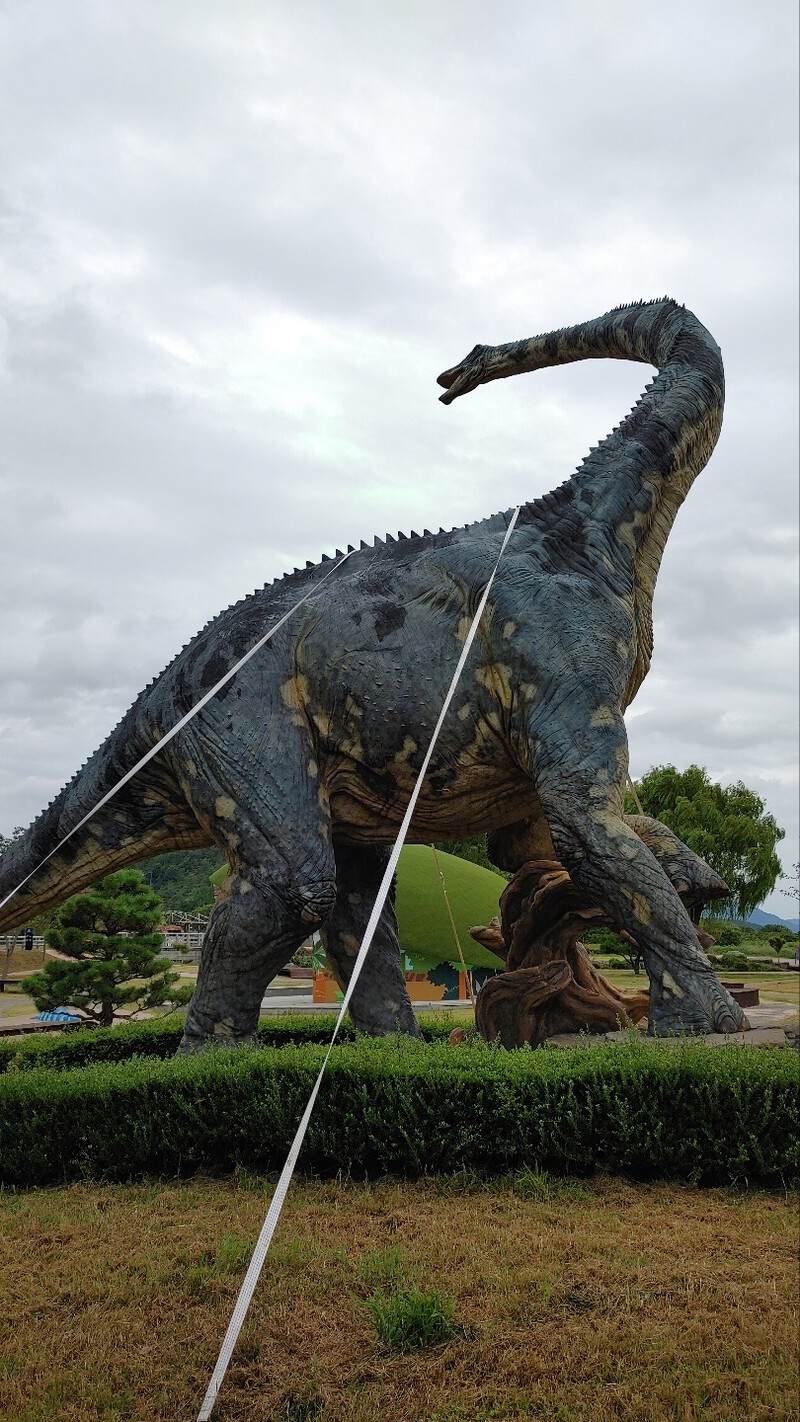 These photos provided by Haenam-gun, Jeollanam-do, show dinosaur models on display outside the Dinosaur Museum on the 3rd, tied tightly with ropes. Haenam-gun has begun to prevent damage by tying up dinosaur models as Typhoon Hinnamnor moves north toward the Korean Peninsula.