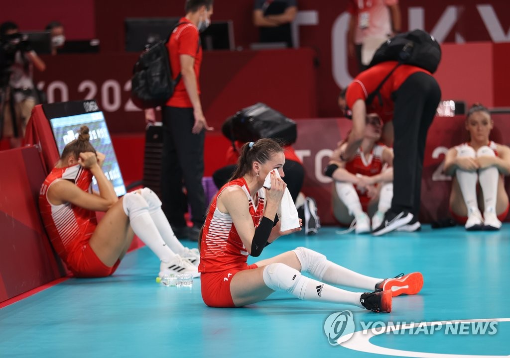 | ▲ [올림픽] 아쉬워하는 터키대표팀 (도쿄=연합뉴스) 이지은 기자 = 4일 일본 아리아케 아레나에서 열린 도쿄올림픽 여자 배구 8강 한국과 터키의 경기에서 한국에게 진 터키대표팀 선수들이 아쉬워하고 있다. 2021.8.4 jieunlee@yna.co.kr |