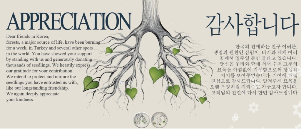 이 단체는 "한국의 친애하는 친구 여러분, 생명의 원천인 삼림이 터키와 세계 여러 곳에서 일주일 동안 불타고 있습니다"라며 "당신은 우리와 함께 서서 수천 그루의 묘목을 아낌없이 기부함으로써 지지를 보여주었습니다"고 말했다.