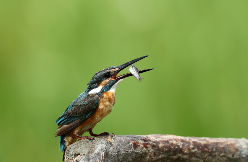 An Eurasian kingfisher is swallowing the fish it has hunted.