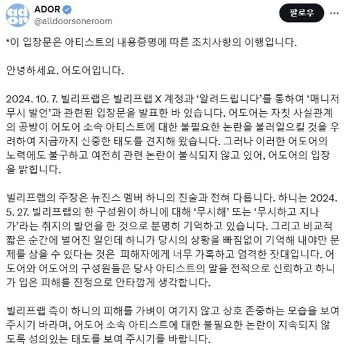 In a statement released on Wednesday via its official X (formerly Twitter) account, ADOR asserted, "Hanni clearly recalls hearing a Belift Lab staff member say 'ignore her' or words to that effect about her on May 27. ADOR fully trusts our artist's account and deeply regrets the harm caused to Hanni."