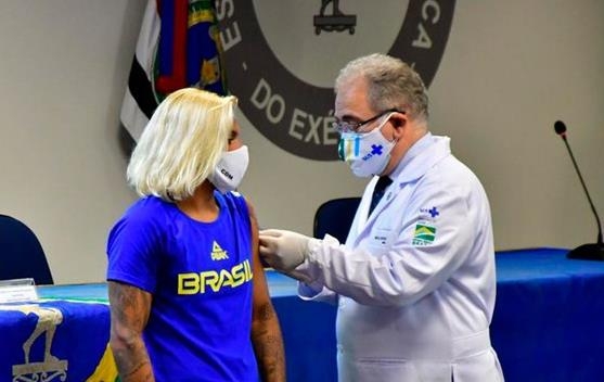 | ▲ 브라질 올림픽 대표선수들 75%만 백신 접종 마르셀루 케이로가 브라질 보건부 장관(오른쪽)이 도쿄 올림픽 참가 선수에게 코로나19 백신을 접종하고 있다. [브라질 보건부 제공] |