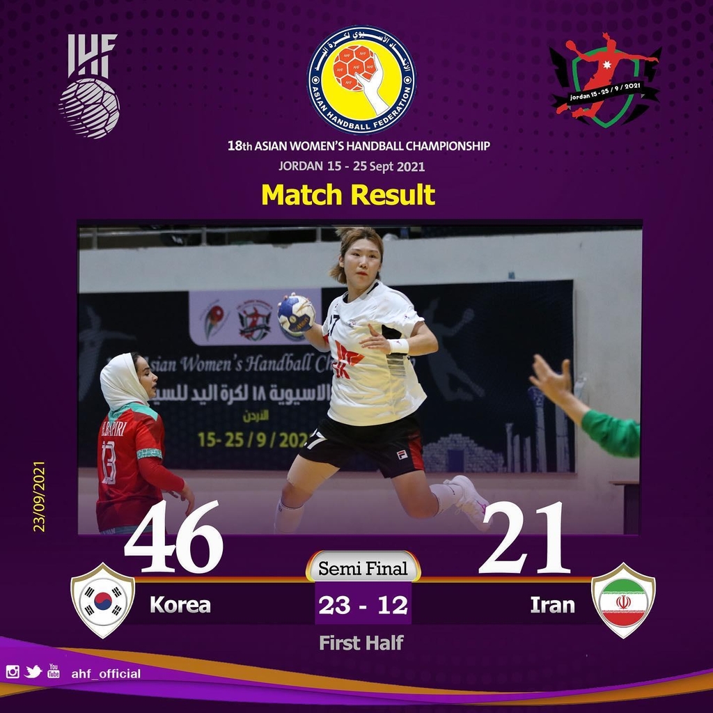 한국은 24일(한국시간) 요르단 암만에서 열린 제18회 아시아여자핸드볼 선수권대회 6일째 이란과 준결승에서 46-21로 크게 이겼다.