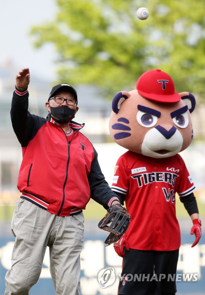 | ▲ '레전드 데이' 시구하는 김응용 전 감독 (광주=연합뉴스) 조남수 기자 = 24일 광주-기아챔피언스필드에서 열린 2021 KBO 프로야구 삼성 라이온즈와 KIA 타이거즈의 경기에서 '타이거즈 레전드 데이'로 초청된 김응용 전 감독이 시구하고 있다. 2021.4.24 iso64@yna.co.kr |