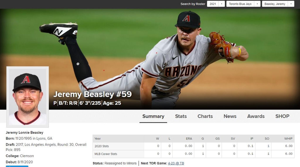 류현진(34)이 마운드를 이끄는 토론토는 23일(이하 한국시간) 최근 애리조나 다이아몬드백스에서 지명 양도된제레미 비슬리(25)를 영입했다고 발표했다.